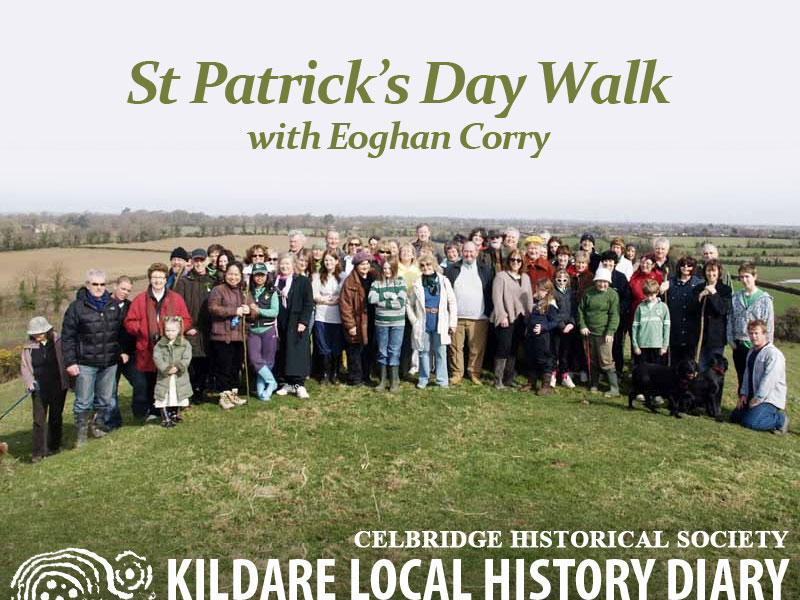 As St Patrick’s Day approaches, we are planning our annual visit to Ardrass, on the road to Barberstown. First, the ruined 15th century church dedicated to St Patrick and still with its stone roof, sitting on an earlier ecclesiastical site. An onward walk to the holy well nearby, maintained with care – there is a lovely image of it on the cover of a gazetteer of the holy wells of Kildare produced by Kildare County Council. And finally a climb above the well, to the top of St Patrick’s hill with its wonderful view for miles around.
